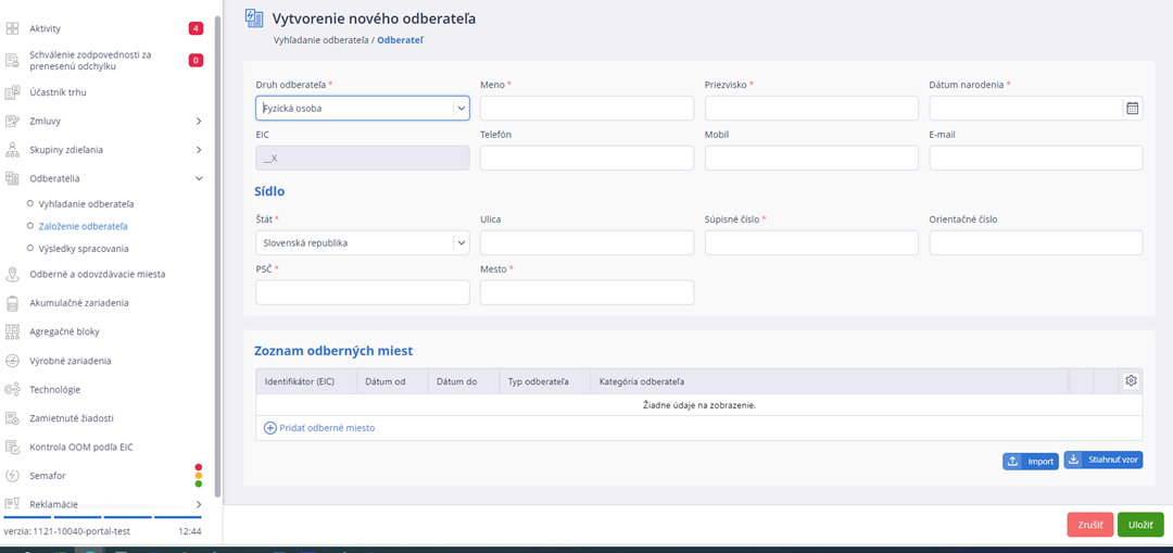 Vyplňte Druh odberateľa a všetky údaje označené hviezdičkou. V prípade, že evidujete aj iné údaje, prosím doplňte ich do príslušného poľa.