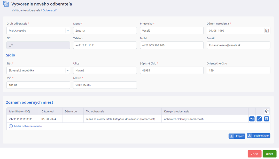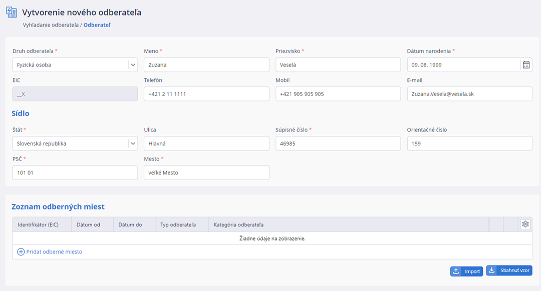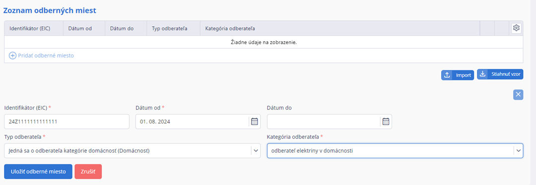 Vložte všetky odberné miesta, ktoré u vás odberateľ má spolu s dátumom od, typom odberateľa a kategóriou odberateľa.